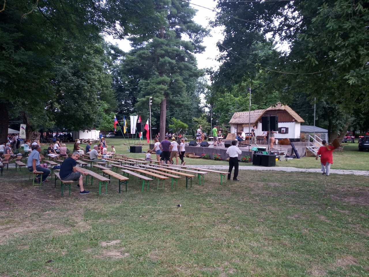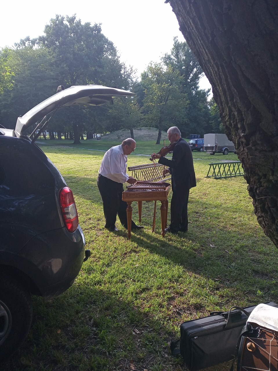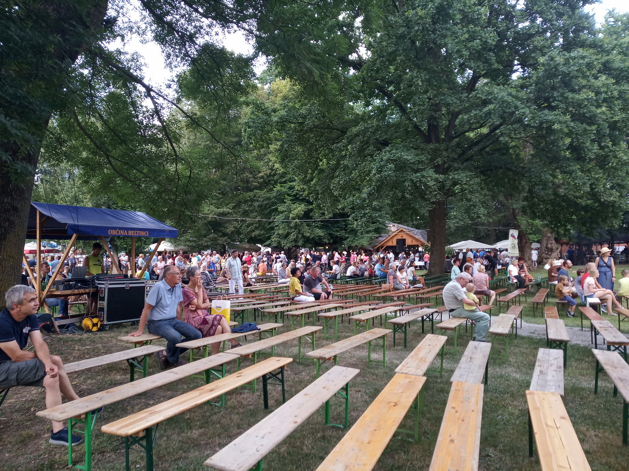 Furcsa, hogy Dobranakot (Dobronakot, Lendvavásárhelyt), a szlovéniai Muravidék magyarok által leginkább lakott települését nem sok kilométerrel haladjuk túl és már egy olyan községbe, Belatincba érünk 2019. július 20-án, amelynek 49. nemzetközi folklórfesztiválján három, vagy négy emberrel találkoztunk (a közönség soraiból), aki magyarul beszélt. Egy másik közeli település, ahol magyarajkúak nagyobb számban előfordulnak talán még Radamos. Az érdekes történelmi vár környékén megrendezett impozáns fesztivál sok résztvevőt vonzott, két színpadon zajlottak az események, gasztronómiai élményeket is kínálva. A helyi – magyar népies műdalokkal is átitatott – szlovén folklórt bemutató ifjúsági zenekar és egy szarajevói világzenei együttes után léptünk színpadra. Az egyik képen éppen vendégzenészünkkel, a keszthelyi Bakos Zoltán cimbalmossal próbál prímásunk, Schreiner Jenő. A magyarországi vonószenét bemutató szatmári és muravidéki-zalai összeállításaink után és közben moldvai furulyás-kobzos-dobos és cigányzenei cimbalmos-brácsás-bőgős számot is játszottunk a kitartó és szépszámú közönség előtt és talán életünkben először kóstolhattuk meg a rántott békacombot, ezáltal egy újabb gasztronómiai élménnyel is gazdagodva.