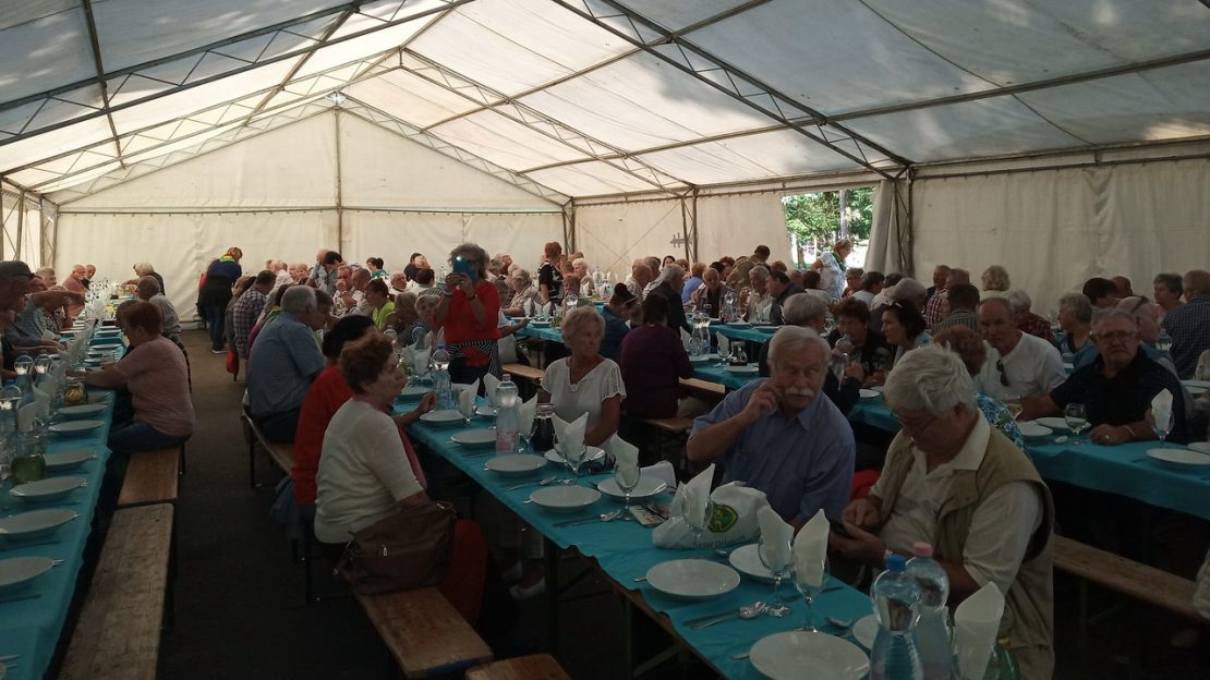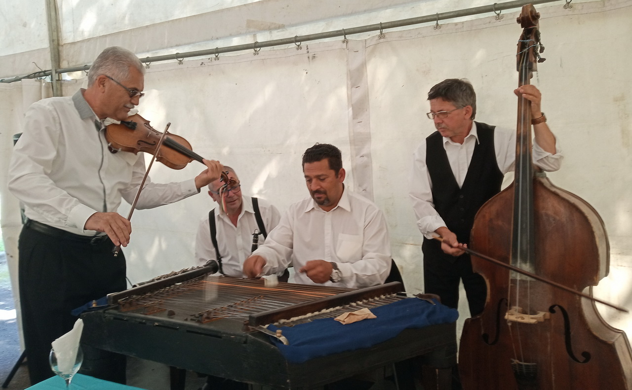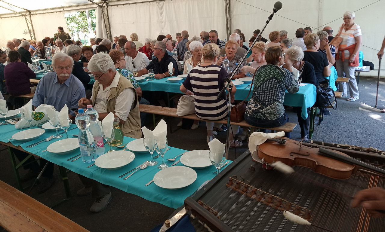 A zalaegerszegi falumúzeumban 320 főnek muzsikáltunk jó ebédhez 2019. szeptember 12-én. Ez a Gysev-nyugdíjasok találkozója volt, akiket három különbusz hozott és vitt a vasútállomás és a skanzen között. Odaérkezésünkkor – ahogy a képek is bizonyítják – a hatalmas tömeg betöltötte a falumúzeumot, mindenki annak más-más részein sétált, nézelődött, majd az olajipari múzeum sátrába gyülekeztek, ahol a Gyuri csárda gasztronómiai élvezetekkel gazdagította őket, kedves és gyors kiszolgálással párosulva. Már-már állandónak számító vendégzenészeink: Baranyai Lajos klarinétos és Albert Elemér cimbalmos segítségét ezúttal is köszönjük. Velük együtt reménykedtünk abban, hogy a hatalmas sátor legtávolabbi részén is jól lehetett hallani a zenét: a visszajelzések alapján ez így volt és volt, aki még távolabb is ült, de ő is énekelte a nótát. Zenélésünk egyeseket még táncra is serkentett és a zenélésre rendelt idő végeztével a vendégsereg tapsával és „Vissza! Vissza!” – ritmikus bekiáltásaival adta tudtunkra, hogy szeretne még minket hallani, ezért egy kicsit ráhúztunk a kedvükre. Jó hangulatban végződött ez a délután, élményeink emlékkönyvében így fogjuk majd visszaidézni, ha eszünkbe jut.