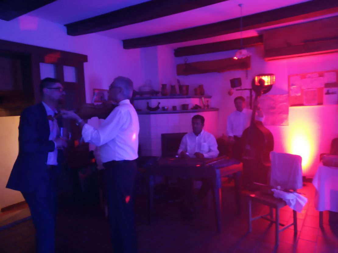 Amikor az ember a világ végén is túl megy; na: ott kell balra fordulni. Oda, az Őrségben fekvő Szalafő Gatter fogadójába invitáltak minket egy lakodalomba a menyecsketáncot lekísérni 2019. augusztus 10-én / 11-én. A násznép legfőképpen fiatal párokból állt, de a lakodalmi DJ foglalkoztatása mellett a szervezők arra gondoltak: mi lenne, ha a menyecsketáncot hagyományos élőzenére csináltatnák meg. A kísérlet eredménye sikeres volt: az újasszonyt mindenki megtáncoltatta és adakoztak is az ifjú pár számára a kosárba, mi pedig az ilyenkor szokásos lassúcsárdás-dallamokat húztuk („Lakodalom van a mi utcánkban”, „Asszony, asszony, az akarok lenni”, stb.), Baranyai Lajos klarinétossal és Albert Elemér cimbalmossal kiegészülve.
